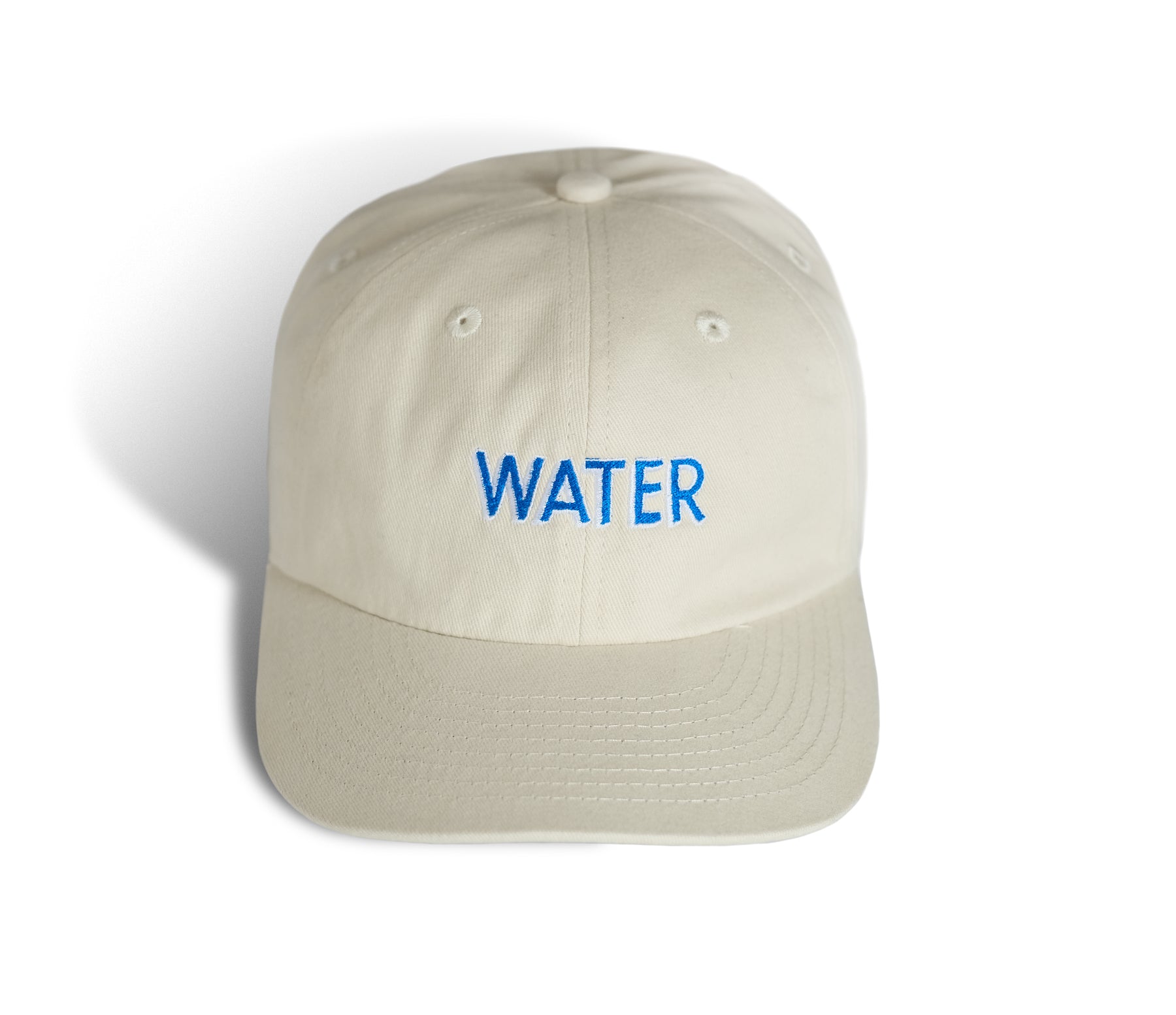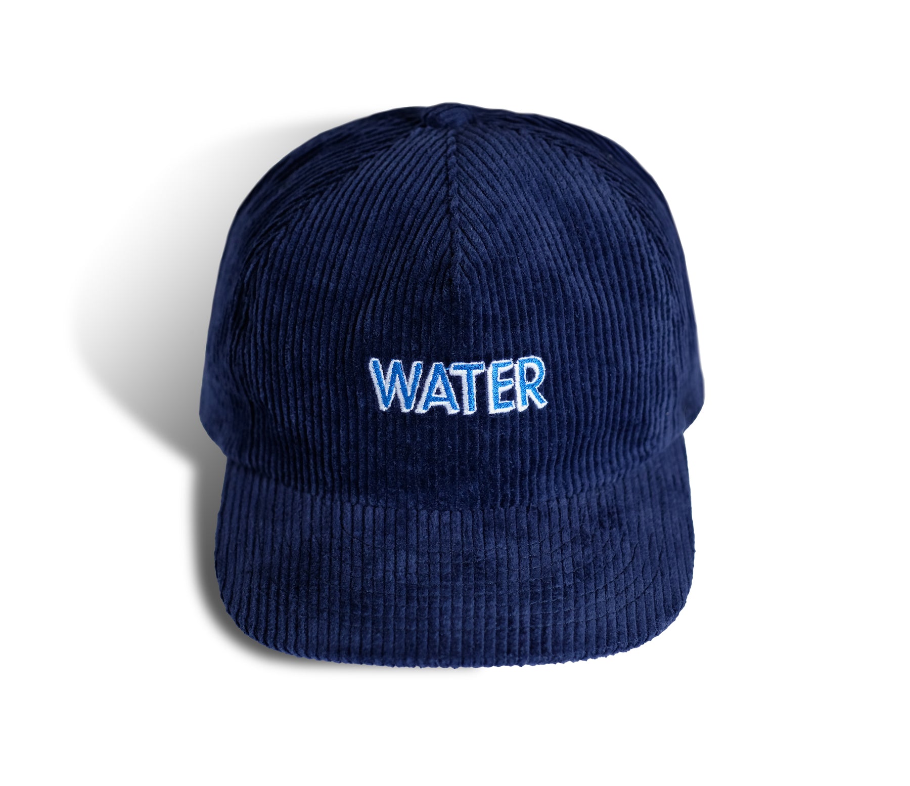 Classic hat with two-tone white-and-blue embroidery on front, available in a navy blue cotton, cream cotton, or navy blue corduroy.