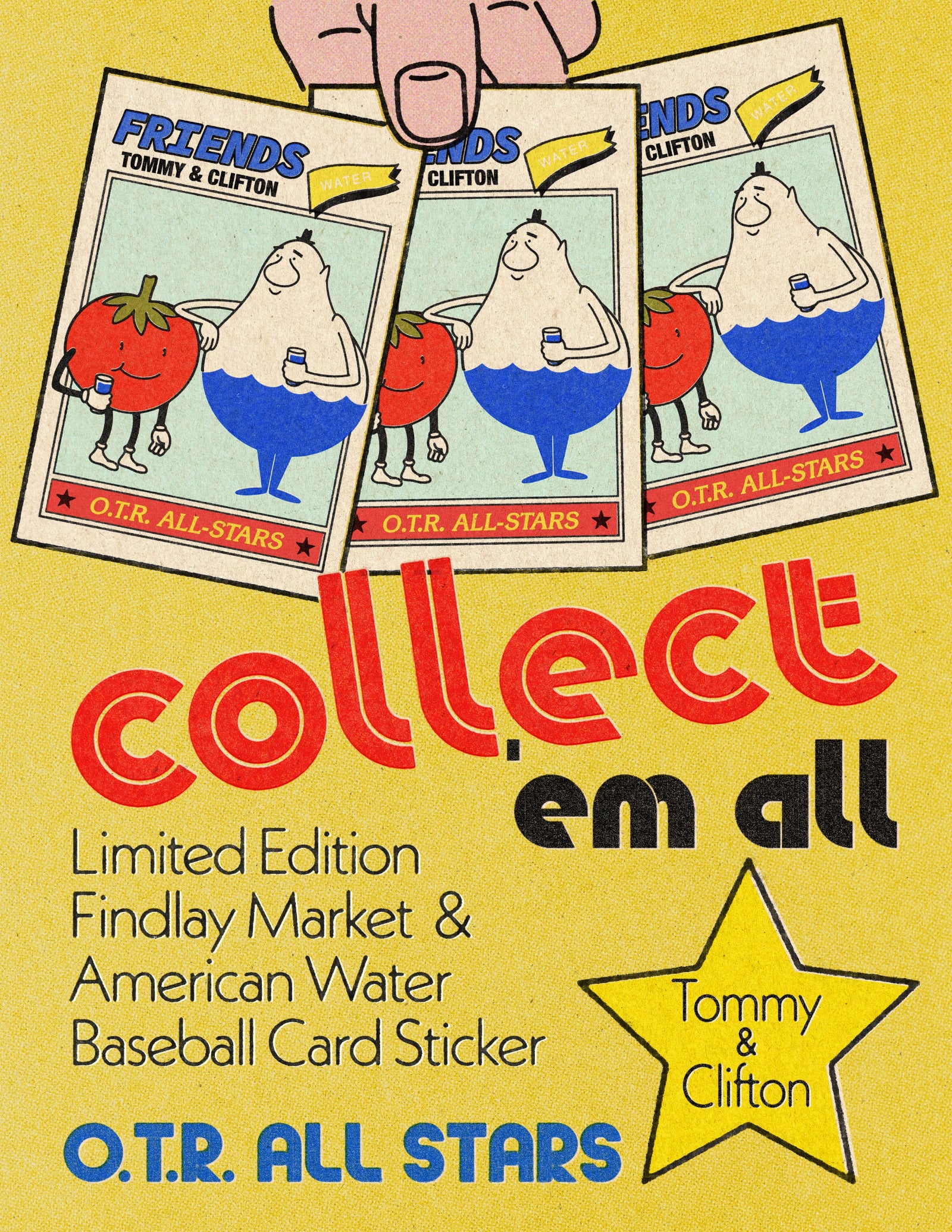 The Opening Day Baseball Card Sticker featuring Tommy the Tomato and Clifton. A Limited Edition release from Findlay Market and American Water.